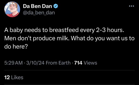 Man who doesn’t understand anything about childcare (e.g., formula nor pumping breast milk for bottle feeding):