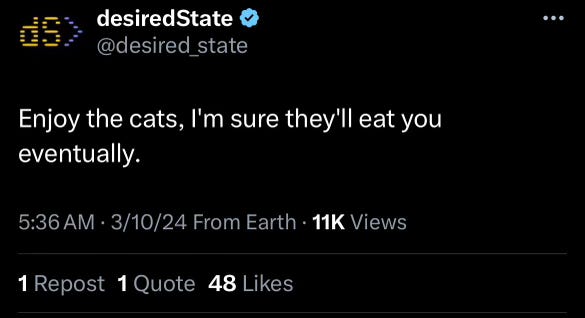 Man telling me to enjoy the cats and that they will eat me eventually (tbh I’m more of a dog person)
