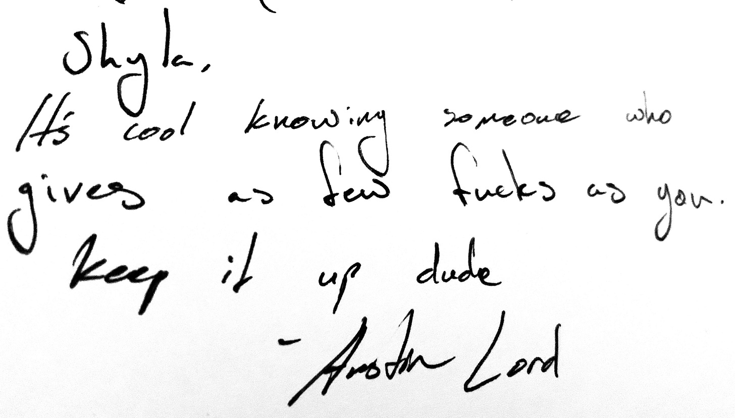 The image I included is a note from a friend in my high school senior yearbook. I didnât give a fuck then and I donât give a fuck now. I am free and in love with my freedom to explore and follow my wild visions and curiosities, uncensored by the concern for and the self-policing of societal pressures. Because I donât give a fuck.